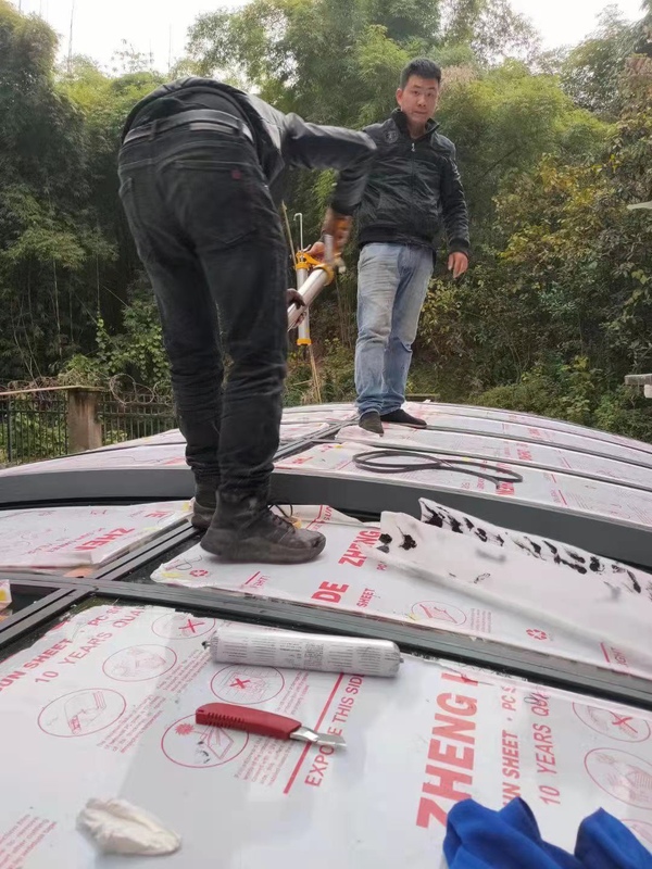 安装工序:工人正在顶部铺设带保护膜的 PC 耐力板,PC 耐力板10 年质保,并用结构胶和专业工具进行固定密封,确保防水抗风。