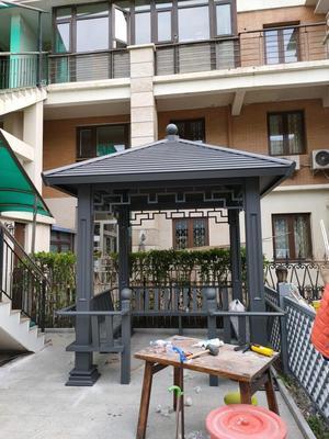 风格与材质的融合:凉亭框架融入了中式棂格纹样,这些细节是通过铝合金型材的精准加工实现的,既保留了新中式的雅致韵味,又比传统木质凉亭更耐用、不易变形褪色。